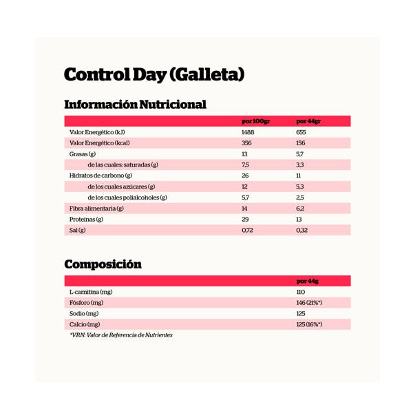 Las barritas Control Day son ricas en proteína y fibra, reducidas en azúcar, además, en su composición cuenta con L-Carnitina.