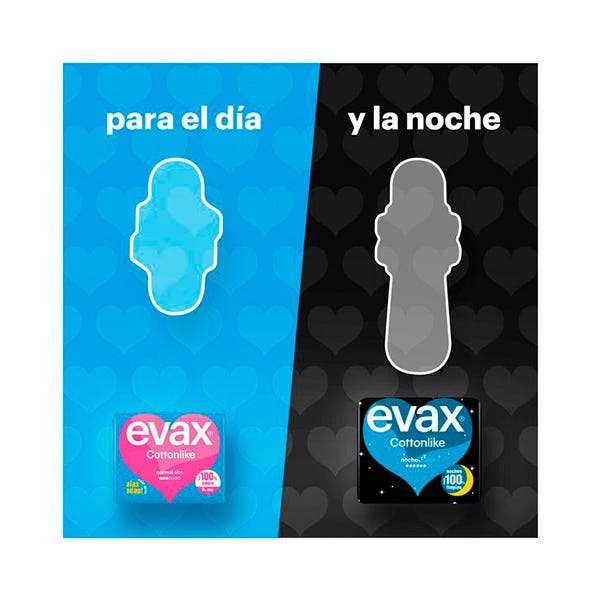 Las compresas Evax Cottonlike absorben el flujo menstrual y te ayudan a mantenerte totalmente limpia y sin rastro de olor. El Sistema Evax Cottonlike Dual incorpora unas perlas activas que neutralizan el olor y su núcleo superabsorbente captura el flujo menstrual al instante. De larga duración, con alas para mantenerse en su sitio y una cobertura Cottonlike para mayor suavidad, estas compresas harán que te sientas cómoda y te permitirán seguir con tu día sin interrupciones. Disponibles en diferentes niveles de absorción: Normal y Normal Plus para los días de flujo leve o normal; Super y Super Plus para los días de flujo abundante o muy abundante.