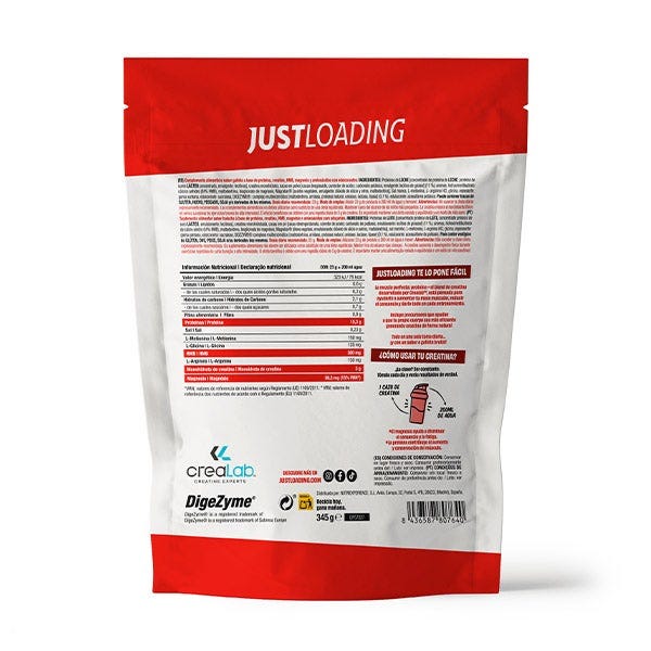 Proteínas de LECHE [concentrado de proteína de LECHE, proteína de suero LÁCTEO concentrada, emulgente: lecitinas], Sal marina, Creatina monohidrato, L-metionina, Cacao en polvo [cacao desgrasado, corrector de acidez: carbonato potásico, emulgente: lecitina de girasol], L- arginina HCl, Aromas, Glicina, Hidroximetilbutirato cálcico anhidro (84% HMB), Espesante: goma xantana, Maltodextrina, Edulcorante: sucralosa, Bisglicinato de magnesio, DIGEZYME® : complejo multienzimático [maltodextrina, amilasa, proteasa natural, celulasa, lactasa, lipasa], Magrabar® [aceites vegetales, emulgente: dióxido de silicio y otros, maltodextrina], Edulcorante: acesulfamo potásico