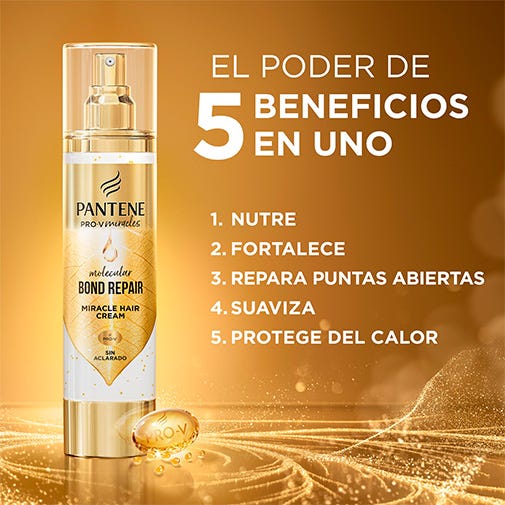 UN PELO MÁS FUERTE Y SALUDABLE con Molecular Bond Repair de Pantene; las perlas Nutri Pro-V se disuelven al instante, liberando nutrientes en profundidad; para obtener mejores resultados, combínala con toda la gama Molecular Bond Repair