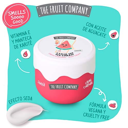 Crema Corporal The Fruit Company Efecto Seda aroma a Sandía. Crema corporal fragancia a sandía y con aceite de aguacate. Hidrata en profundidad la piel y se absorbe rápidamente para que no tengas que esperar a vestirte. El aroma perdura durante bastante tiempo en la piel. Hidratación profunda con aceite de aguacate, manteca de karité y vitamina E.