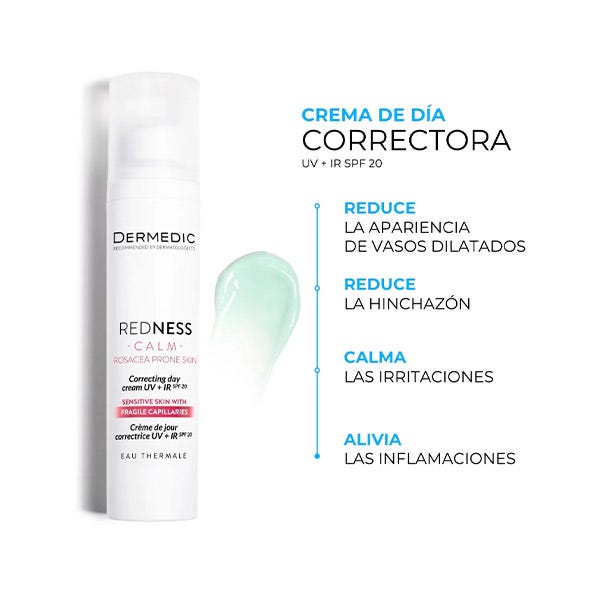 REDNESS Crema de día correctora UV+IR SPF20 nutre, fortalece y protege la piel con cuperosis, reduciendo visiblemente la aparición de capilares dilatados.