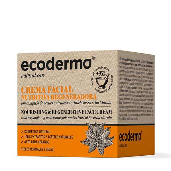 La crema facial nutritiva regeneradora de Ecoderma está enriquecida con complejo de aceites nutritivos y extracto de Swertia chirata.