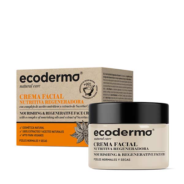 La Crema Facial Nutritiva Regeneradora de Ecoderma, está elaborada con ingredientes activos de origen natural altamente eficaces a la vez que respetuosos con la piel y el medio ambiente.