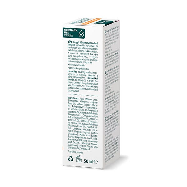 Aqua (Water), Urea, Simmondsia Chinensis (Jojoba) Seed Oil, Sodium Lactate, Glycerin, Polyglyceryl-3 Polyricinoleate, Sorbitan Oleate, Hydrogenated Vegetable Oil, Calendula Officinalis Flower Extract**, Citrus Aurantium Dulcis (Orange) Peel Oil, Litsea Cubeba Fruit Oil, Panthenol, Tocopheryl Acetate, Rosmarinus Officinalis (Rosemary) Leaf Oil, Menthol, Citral, Limonene, Geraniol, Citronellol, Linalool, Eugenol, Parfum (Fragrance), Magnesium Sulfate, Sucrose Polystearate, Lactic Acid, Rosmarinus Officinalis (Rosemary) Leaf Extract, Helianthus Annuus (Sunflower) Seed Oil, Glycine Soja (Soybean) Oil, Tocopherol. **certified organic