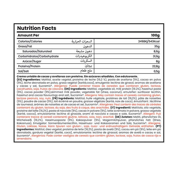 Maltitol, aceite vegetal, proteína de leche (16,2 %), pasta de avellana (9%), cacao en polvo (9%), leche desnatada en polvo, grasa vegetal (karité,coco), emulgente: lecitina de girasol, aromas de avellana y cacao y sal, Sucramix®.
