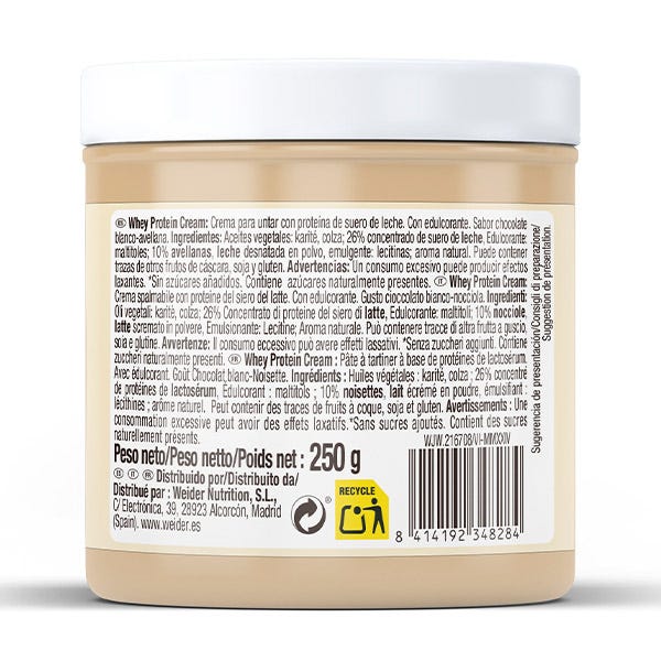 Whey Protein Creme es una deliciosa crema de chocolate blanco para untar elaborada con auténticas avellanas y proteína de suero de alta calidad, ideal para regalarte un momento de placera la vez que cuidas tu figura. Además, esta nueva versión mejorada no contiene aceite de palma.