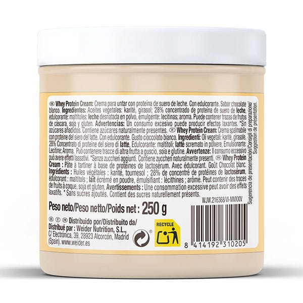 Whey Protein Creme es una deliciosa crema de chocolate blanco para untar elaborada con auténticas avellanas y proteína de suero de alta calidad, ideal para regalarte un momento de placera la vez que cuidas tu figura. Además, esta nueva versión mejorada no contiene aceite de palma.