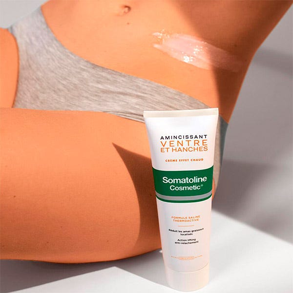 Somatoline Cosmetic Vientre y Caderas Crema Efecto Calor es una crema termoactiva rica en textura que se masajea fácilmente y no deja residuos.