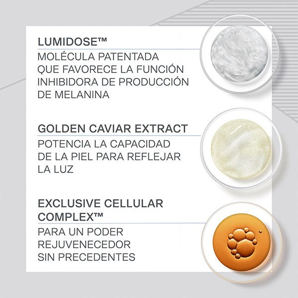 • El Extracto de Caviar dorado, de la más alta calidad y obtenido de fuentes sostenibles, contiene nutrientes que permiten reafirmar la piel y refinar su textura dejándola sumamente suave al tacto.