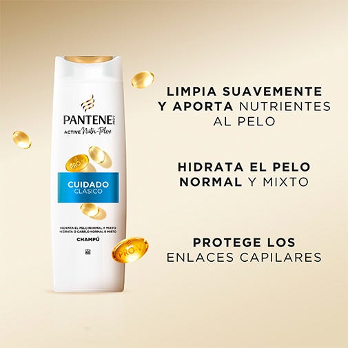 Limpia suavemente y alimenta el cabello con nutrientes Pro-V activos para ayudar a protegerlo, dejándolo con un aspecto bonito y saludable. Este champú Pantene Cuidado Clásico: Aporta una hidratación equilibrada para el cabello normal y mixto; aporta un brillo saludable y deja el cabello suelto y manejable.