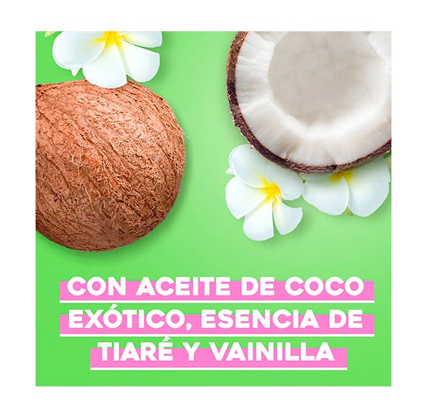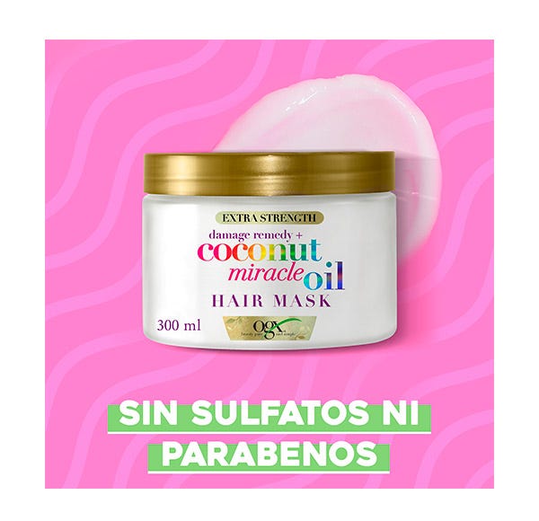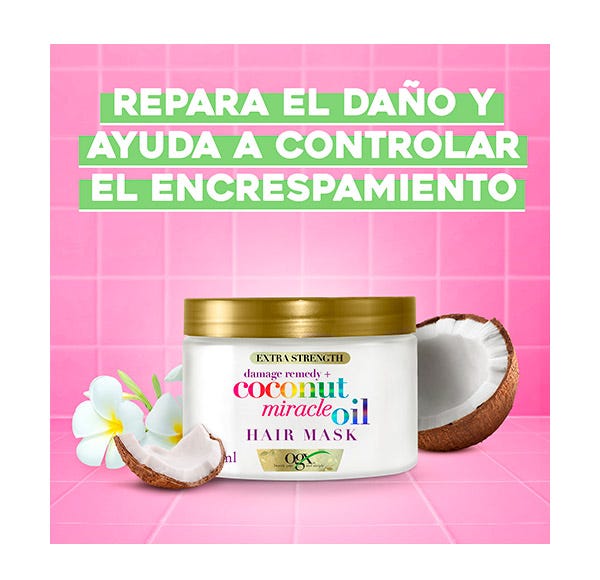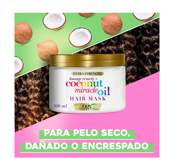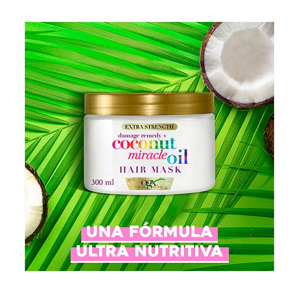 La mascarilla capilar OGX Damage Remedy + Coconut Miracle Oil es una mezcla enriquecida con aceite de coco, extracto de vainilla y esencia de tiaré.