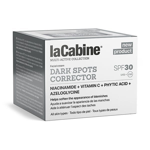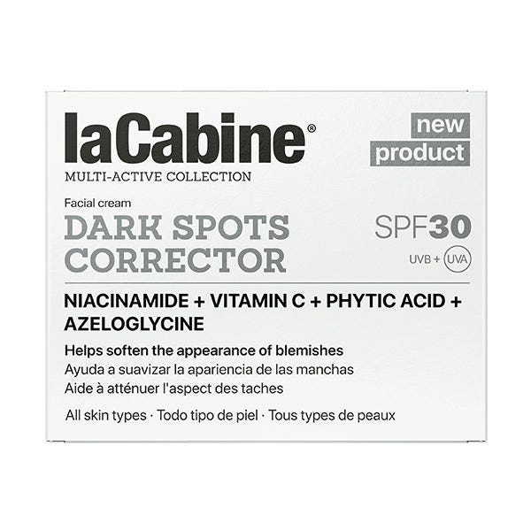 La Cabine Dark Spots Corrector Crema facial con SPF30 y un complejo antimanchas con Niacinamida, Vitamina C, Acido Fítico y Azeloglicina.