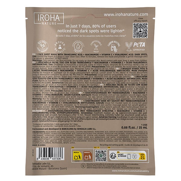 La Mascarilla Antimanchas con un 96% de ingredientes naturales tiene un efecto triple despigmentante gracias a su fórmula con Ácido Tranexámico, Niacinamida y Vitamina C, activos que inhiben diversas vías que promueven la hiperpigmentación consiguiendo prevenir y reducir las manchas del rostro.