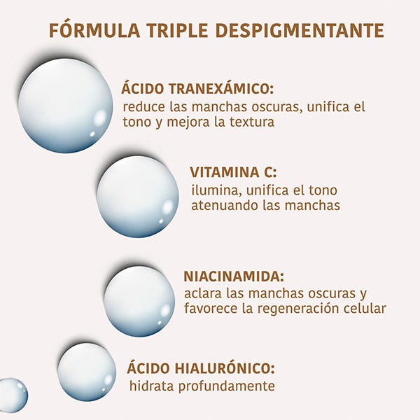 El ácido tranexámico inhibe las vías inflamatorias que promueven la hiperpigmentación, bloqueando la actividad de los melanocitos (células productoras de melanina), reduciendo así la cantidad de melanina atenuando las manchas. Por otro lado, La niacinamida complementa este efecto al bloquear la transferencia de melanosomas a la superficie cutánea disminuyendo así los niveles de melanina que llegan a la superficie, aclarando las manchas. La Vitamina C actúa como un potente antioxidante, inhibiendo la tirosinasa, enzima responsable de la síntesis de melanina. Además, el Ácido Hialurónico proporciona una hidratación profunda y duradera.