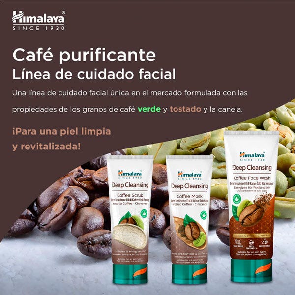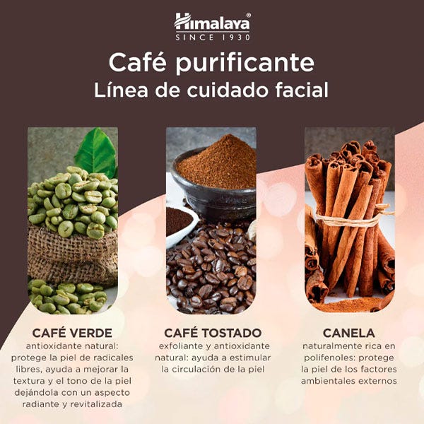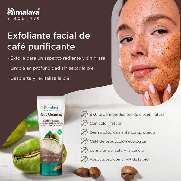 El Exfoliante facial de acción profunda de Café de Himalaya contiene una mezcla efectiva de Café Arábica y Canela que exfolia suavemente las células muertas de la piel. Los granos de Café Arábica tostados y verdes, ricos en potentes antioxidantes, contribuyen a una piel mas radiante y fresca y junto con la canela, ayudan a proporcionar una sensación de energía.