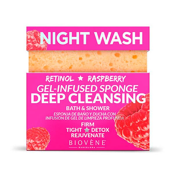 Esponja de baño y ducha multifuncional para limpieza profunda infundida con retinol extra reafirmante, frambuesa y aceite de coco que aprieta, hidrata y elimina instantáneamente la suciedad de la piel.