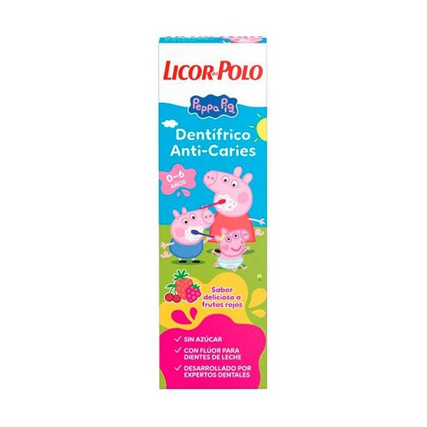 ¡Descubre el cepillado con Peppa y sus hermanos! La pasta de dientes Licor del Polo x Peppa ha sido especialmente desarrollada para proteger contra las caries desde la aparición del primer diente de leche. Su fórmula con calcio fortalece los dientes de leche y ayuda a formar una base sólida para unos dientes permanentemente sanos. Contiene 1000 ppm de flúor y su delicioso sabor a frutos rojos convierte el cepillado en un momento divertido cada día.