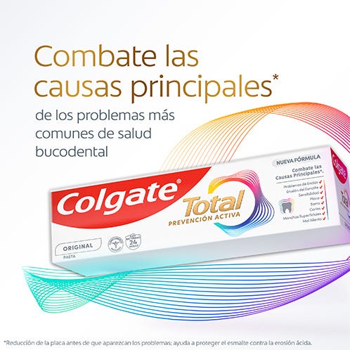 Cuidar la salud de tu sonrisa y mantenerla protegida empieza antes de que aparezcan los problemas de salud bucal. La nueva fórmula de Colgate Total Prevención Activa Original ha sido científicamente diseñada para la prevención activa y para combatir las causas principales* de los problemas más comunes de salud bucondental³. Con 24 horas de protección antibacteriana¹ probada clínicamente y un sistema² único que estabiliza el ingrediente de prevención activa, está diseñada para un rendimiento superior⁴. Justo lo que necesitas para proteger tu sonrisa de futuros problemas de salud bucodental.
