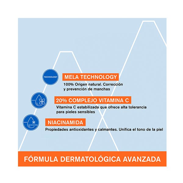 Ingredientes activos dermatológicos: [ Mela Technology + 20% Complejo Vitamina C* + Niacinamida]