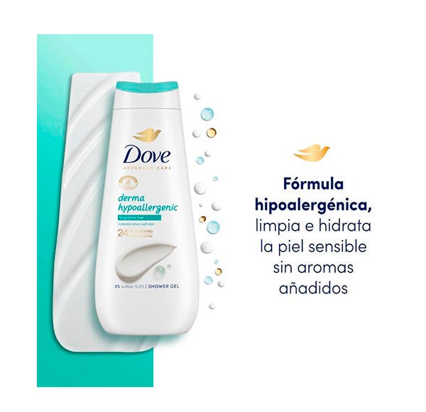Si tienes piel seca y reactiva, entonces estás de enhorabuena. El gel de ducha Dove Advanced Care Hipoalergénico asegura que el cuidado para la piel sensible comience en la ducha. Probado dermatológicamente en piel sensible, este gel de baño para piel muy seca limpia suavemente la piel y tiene una fórmula ultra humectante. Alivia instantáneamente la sequedad y cuida suavemente la piel en solo una ducha.