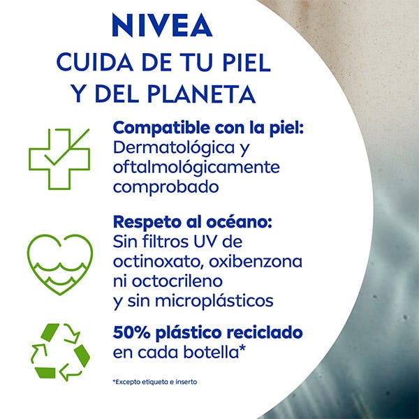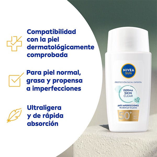El Fluido Facial Derma Skin Clear FP50+ de NIVEA SUN es un fluido ultraligero especialmente desarrollado para piel normal, grasa & con tendencia a las imperfecciones. También es adecuada para piel sensible. Este fluido solar ultraligero protege la piel sana desde el exterior contra los rayos UVA/UVB y de los efectos de la Luz Visible de Alta Energía como el envejecimiento prematuro de la piel. También protege la piel desde el interior gracias al Licocalcón A, un poderoso antioxidante natural que activa la barrera de defensa propia de la piel y protege las células de la piel contra el estrés oxidativo. Este fluido no graso y de rápida absorción contiene un complejo anti-imperfecciones + Niacinamida que protege y previene las imperfecciones absorbiendo el exceso de sebo de la superficie de la piel. No comedogénico y compatibilidad con la piel clínicamente testada. Fórmula respetuosa con los océanos.