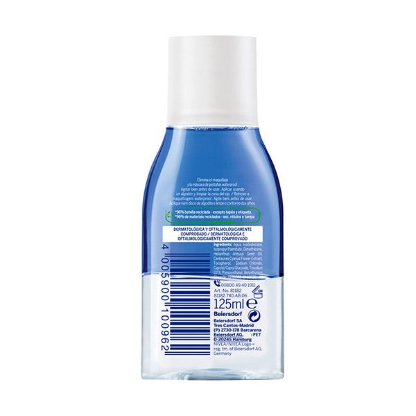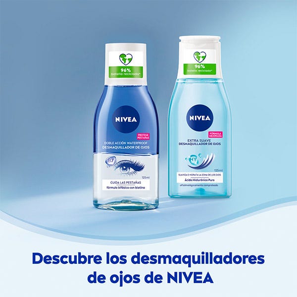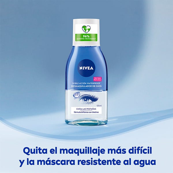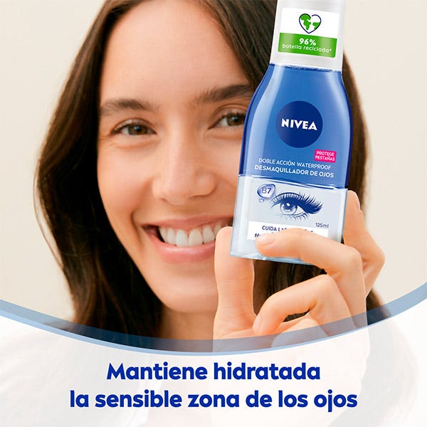 NIVEA Desmaquillador de Ojos Doble Acción elimina eficazmente los restos de maquillaje, incluso el de larga duración sin esfuerzo. La fórmula bifásica de este desmaquillador bifásico está enriquecida con Flor de Aciano y Biotina, para limpiar eficazmente la zona del contorno de los ojos al tiempo que cuida las pestañas. Eficacia y suavidad para eliminar sin esfuerzo el maquillaje y la máscara de pestañas, también waterproof.