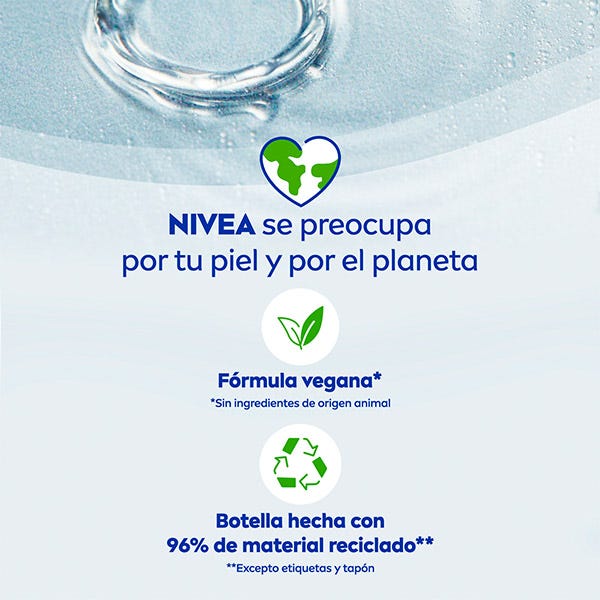 Su fórmula es vegana, sin ingredientes de origen animal y su botella está fabricada con un 96% de material reciclado (excepto el tapón y la etiqueta). La compatibilidad con la piel de este desmaquillador de NIVEA ha sido dermatológica y oftalmológicamente comprobada, y no contiene perfume.