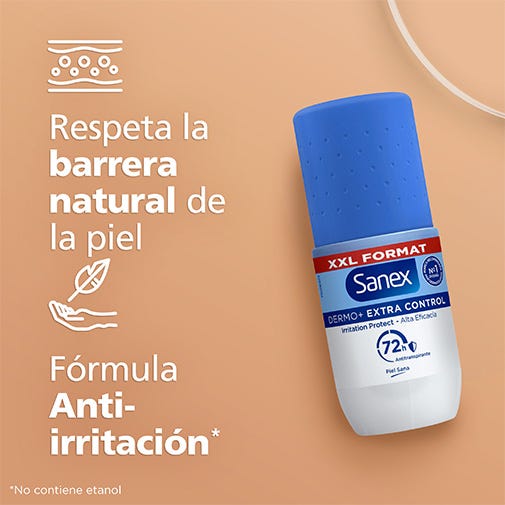 Afronta el día con confianza con el antitranspirante Sanex Dermo+ Extra Control Roll-On. Este antitranspirante de 72 horas te ofrece una protección efectiva y duradera contra el sudor y el mal olor, a la vez que su fórmula anti-irritación* cuida suavemente tu piel.