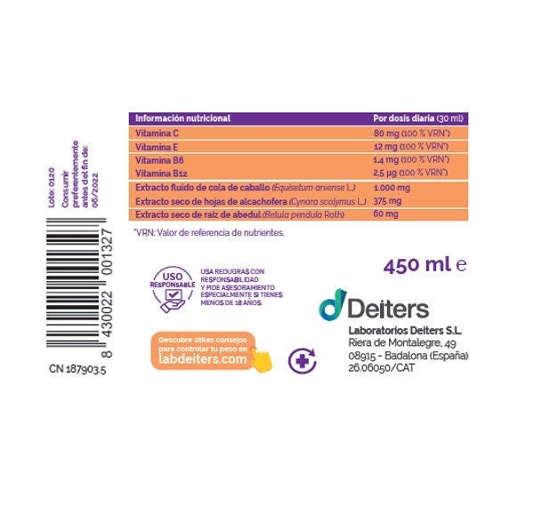 Ingredientes: agua; jarabe de fructosa; extracto fluido de cola de caballo (Equisetum arvense L.); extracto seco de hojas de alcachofera (Cyrana scolymus L.); ácido L-ascórbico (vitamina C); acidulante; ácido cítrico (E330); extracto seco de raíz de abedul (Betula pendula Roth.) (2 %); aroma de melocotón; Conservantes: sorbato potásico (E202), benzoato sódico (E211); DL- - tocoferol (vitamina E) (50%); Colorante: betacaroteno (10 %) (E160a); clorhidrato de piridoxina (vitamina B6); cianocobalamina (vitamina B12) (1 %).