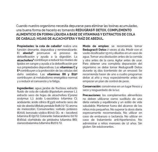 REDUGRAS® DETOX, COMPLEMENTO ALIMENTICIO EN FORMA LÍQUIDA A BASE DE VITAMINAS Y EXTRACTOS DE COLA DE CABALLO, HOJAS DE ALCACHOFERA Y RAÍZ DE ABEDUL.