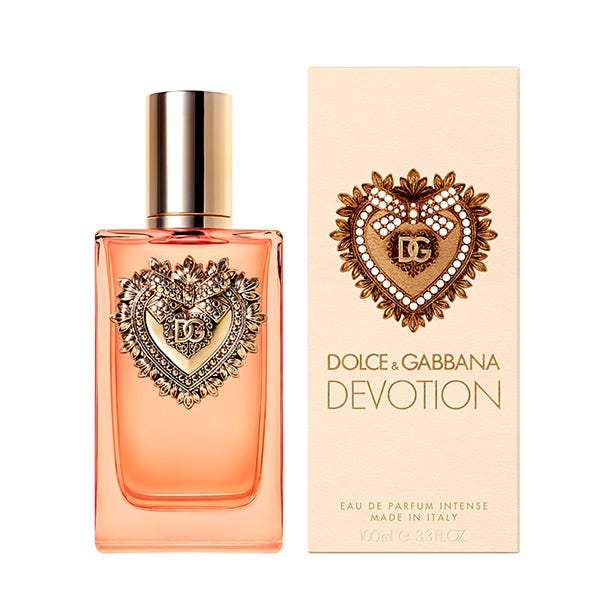 Dolce&Gabbana Devotion Eau de Parfum Intense se encuentra dentro de una vibrante botella de vidrio tintado en ámbar, y adornada con el inconfundible y simbólico Sagrado Corazón."