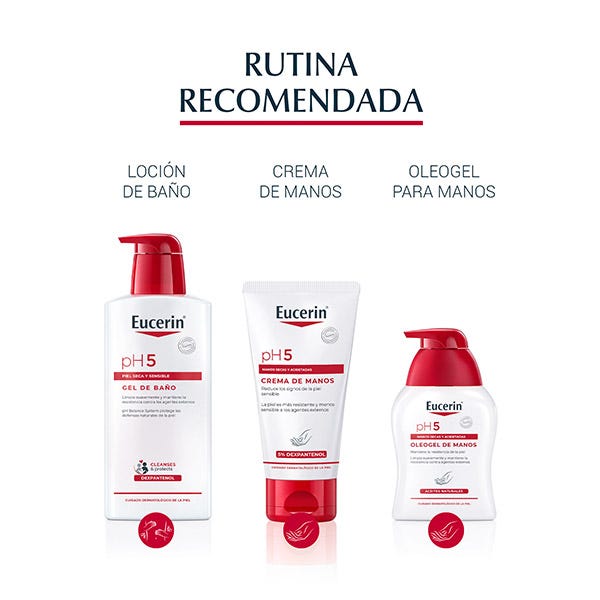 La gama de productos Eucerin pH5 es apta para uso frecuente en la piel propensa a las alergias de tipo 1, como la rinitis alérgica. Antes de aplicar un nuevo producto en todo el cuerpo, haz una pequeña prueba aplicándolo en la piel de la parte interior del codo varias veces.
