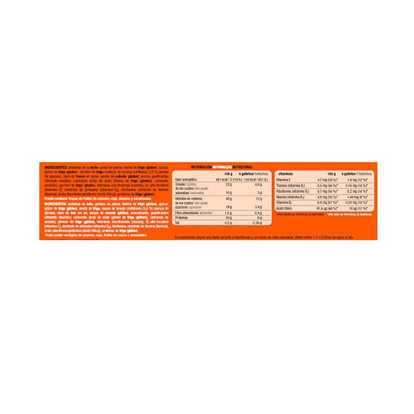 Proteínas de leche, grasa de palma, harina de trigo (gluten), azúcar, gluten de trigo (gluten), almidón de trigo (gluten), cortezas de naranja confitadas (3,8%) (jarabe de glucosa), clara de huevo en polvo, cebada(gluten), aroma, gasificantes (difosfato disódico, carbonato ácido de sodio, carbonato amónico), germen de trigo (gluten), vitaminas (nicotinamida, DL-alfa tocoferol, clorhidrato de piridoxina, riboflavina, clorhidrato de tiamina, ácido pteroilmonoglutámico). Puede contener frutos de cáscara, sésamo, cacahuetes y soja.