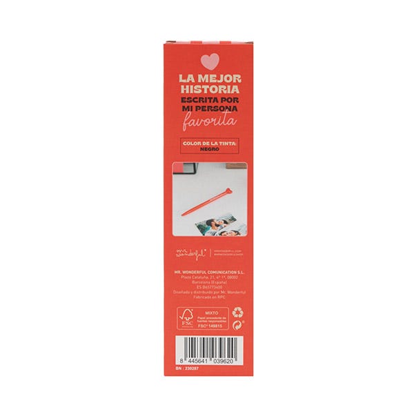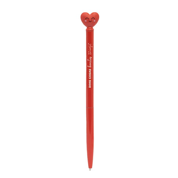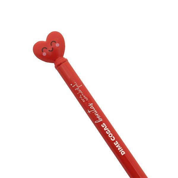 - Bolígrafo de metal con mensaje de amor en español impreso en él y un corazón Mr. Wonderful en su extremo.