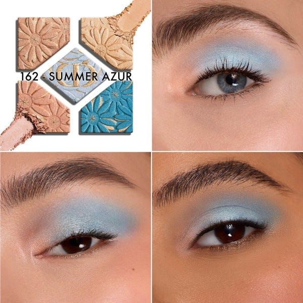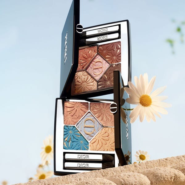 Este verano, Diorshow 5 Couleurs, la icónica paleta de sombras de ojos Dior, revela dos armonías de azules y coral en edición limitada: 162 Summer Azur y 670 Sunset Bronze. El polvo desvela un motivo de margaritas, inspirado en las nuevas creaciones couture, cuyos detalles se ven realzados gracias a las partículas nacaradas bronce en la superficie.