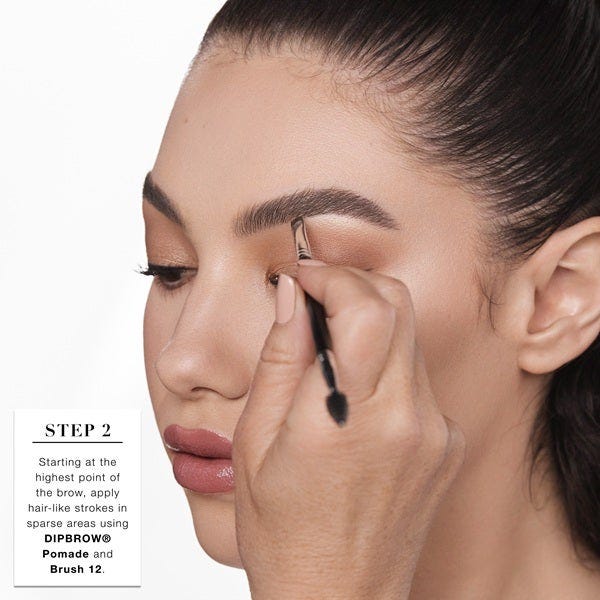 • Para resultados de calidad profesional, aplica DIPBROW® Pomade con el Pincel 12 de Anastasia Beverly Hills, un pincel sintético ideal para aplicar fórmulas en crema y crear una textura natural de cabello, así como para delinear y detallar la ceja. Trabaja el producto de un lado a otro sobre la parte exterior de la tapa del tarro para asegurar que no cargues demasiado producto en el pincel, manteniéndolo delgado.