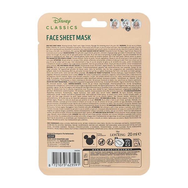 Embárcate en un safari de cuidado de la piel con la aventurera Mascarilla Facial Sence Simba. Con una mezcla calmante de ingredientes hidratantes, esta mascarilla te transporta al relajante y fantástico mundo de 'El Rey León', a la vez que le da a tu rostro una hermosa luminosidad.
