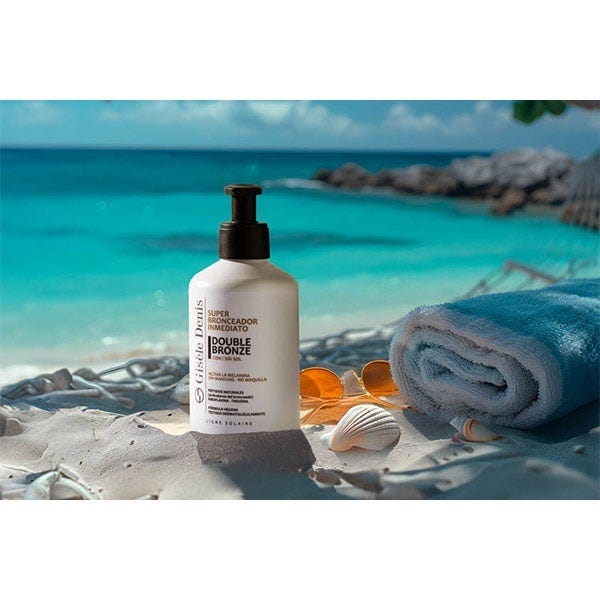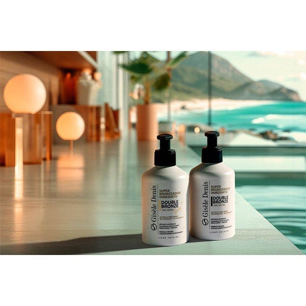 El Super Bronceador Inmediato Corporal Double Bronze de Gisèle Denis genera, acelera y potencia el bronceado de forma natural proporcionando un tono saludable y uniforme. Su innovadora fórmula ejerce una doble acción sobre la producción de melanina.