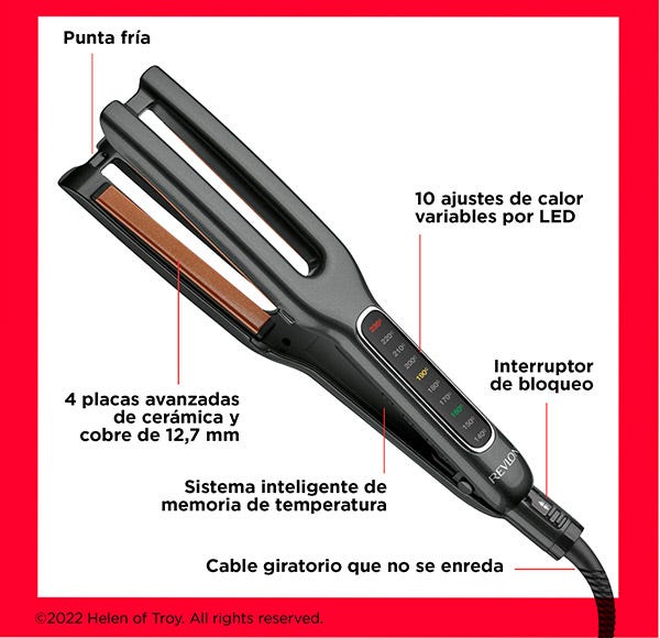 -Tecnología avanzada de cerámica de cobre para una transferencia de calor uniforme superior y un estilo más rápido que resulta en un deslizamiento ultrasuave y un alisado 2 veces más rápido en una sola pasada.