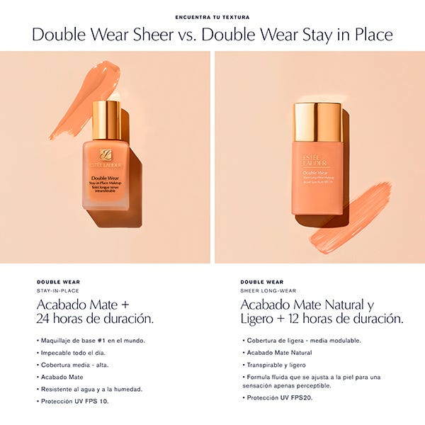 Double Wear Sheer, maquillaje de base con un acabado mate natural, transpirable y ligero, 12 horas de duración. Deja una piel perfecta con un acabado mate fresco y natural. No contiene aceites y controla brillos. Unifica el tono de la piel. Comodidad ligera. La fórmula fluida se ajusta a la piel para una sensación apenas perceptible.
