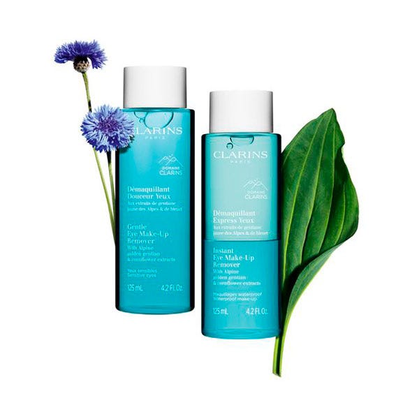 Este desmaquillante está enriquecido con extracto de genciana amarilla bio de los Alpes recolectada en el corazón de la Hacienda Clarins y extracto de aciano bio para una piel del contorno de los ojos calmada.