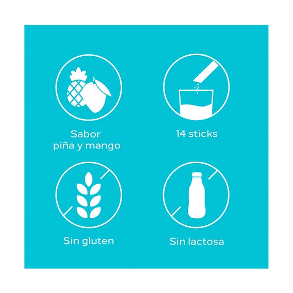Incluye 14 sticks. Sabor a piña y mango. Sin Gluten, Sin Lactosa, Sin Azúcares.