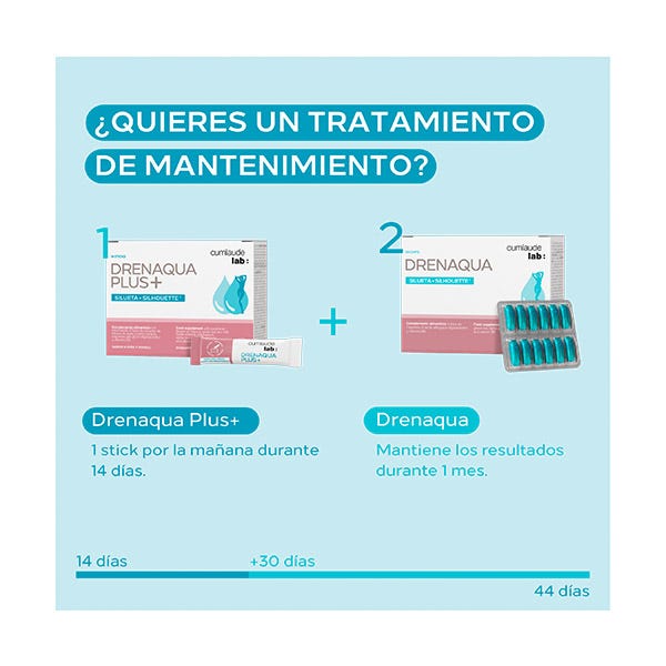 Se recomienda un tratamiento conjunto con Drenaqua: Una vez acabado los 14 días de drenaqua plus, continuaríamos el tratamiento durante 1 mes con 1 cápsula diaria de Drenaqua