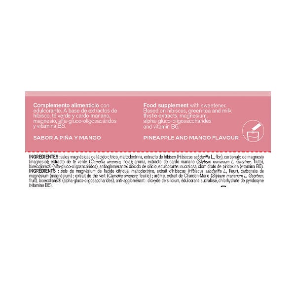 Sales magnésicas del ácido cítrico, maltodextrina, extracto de hibisco (Hibiscus sabdariffa L., flor), carbonato de magnesio (magnesio); extracto de té verde (Camellia sinensis, hoja); aroma, extracto de cardo mariano (Silybum marianum L. Gaertner, fruto), bioecolians® (alfa-gluco-oligosacáridos), antiaglomerante: dióxido de silicio, edulcorante: sucralosa, clorhidrato de piridoxina (vitamina B6).