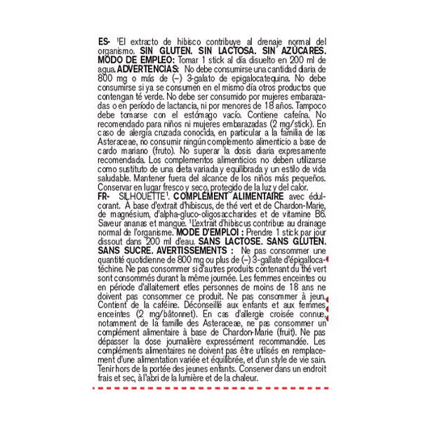Nuevo formato sabor mango y piña en formato sobre que refuerza la acción drenante frente a la retención de líquidos gracias a los nuevos activos incluidos: Hibisco y Cardo mariano.