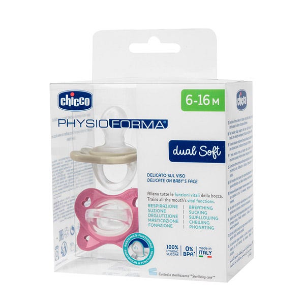 El Chupete Chicco Physio Dual Soft, diseñados para niños de 2 a 16 meses, ofrece una doble suavidad para una comodidad única. Su forma exclusiva entrena las funciones vitales de la boca, favoreciendo un crecimiento sano y un desarrollo oral adecuado. Combina un escudo delgado y compacto con la innovadora tetina PhysioForma, fabricada en 100% silicona, un material higiénico, indeformable y práctico para el uso.