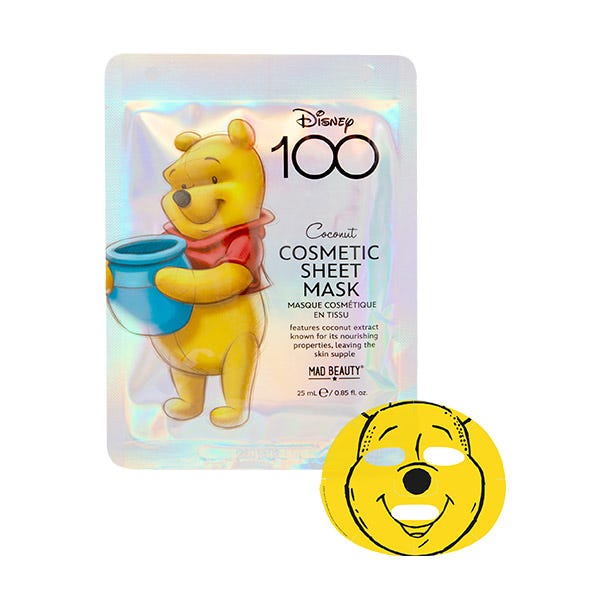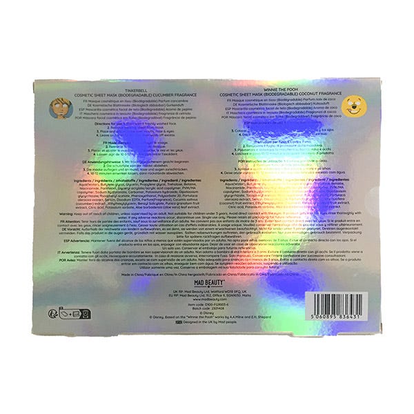 ¡Que empiece el espectáculo y las celebraciones de los 100 años de Disney! Al abrir las cortinas de la caja inspirada en las salas de cine retro, descubrirás un dúo de mascarillas biodegradables con estampados de Winnie the Pooh y Campanilla, ¡listas para hacer maravillas en tu piel! Estas refrescantes mascarillas de fibra están impregnadas de un serum enriquecido con ácido hialurónico hidratante que ayuda a que la piel se sienta hidratada, con fragancias calmantes de pepino y nutritivas de coco.