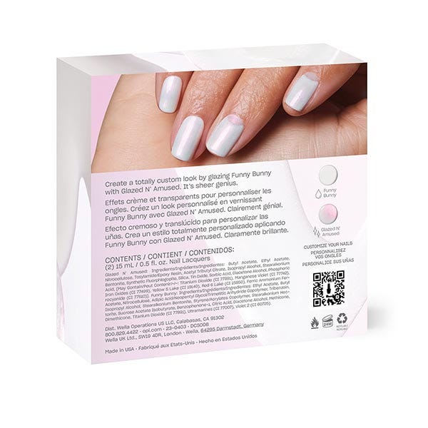 (Glazed N' Amused)Ingredients/Ingrédients: Butyl Acetate, Ethyl Acetate, Nitrocellulose, Tosylamide/Epoxy Resin, Acetyl Tributyl Citrate, Isopropyl Alcohol, Stearalkonium Bentonite, Synthetic Fluorphlogopite, Silica, Tin Oxide, Sorbic Acid, Diacetone Alcohol, Phosphoric Acid, [May Contain/Peut Contenir/+/-: Titanium Dioxide (CI 77891), Manganese Violet (CI 77742), Iron Oxides (CI 77499), Yellow 5 Lake (CI 19140), Red 6 Lake (CI 15850), Ferric Ammonium Ferrocyanide (CI 77510)]. (Funny Bunny) INGREDIENTS: Ethyl Acetate, Butyl Acetate, Nitrocellulose, Adipic Acid/Neopentyl Glycol/Trimellitic Anhydride Copolymer, Tribenzoin, Isopropyl Alcohol, Stearalkonium Bentonite, Styrene/Acrylates Copolymer, Stearalkonium Hectorite, Sucrose Acetate Isobutyrate, Benzophenone-1, Citric Acid, Diacetone Alcohol, Methicone, Dimethicone, Titanium Dioxide (CI 77891), Ultramarines (CI 77007), Violet 2 (CI 60725).