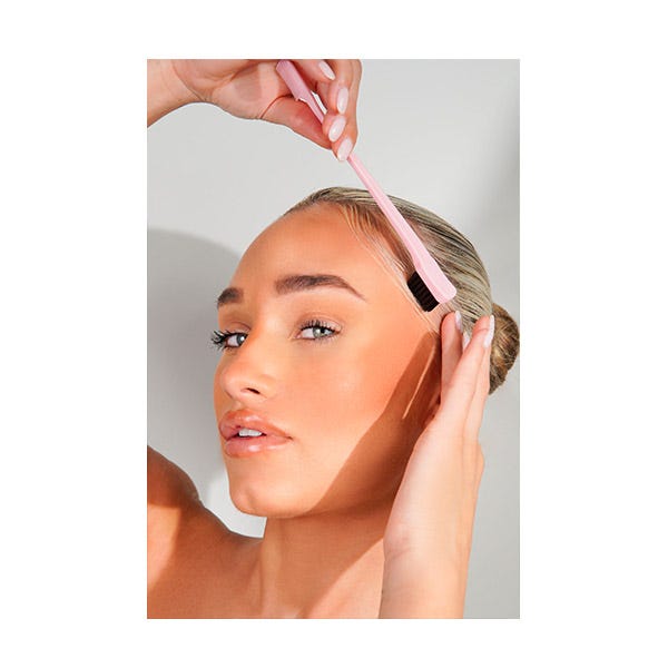 Aplica el producto de estilizado de tu elección y comienza a peinar cualquier cabello rebelde o baby hairs. Usa las cerdas del cepillo para distribuir el producto por el cabello y fijar el estilo liso en su lugar.